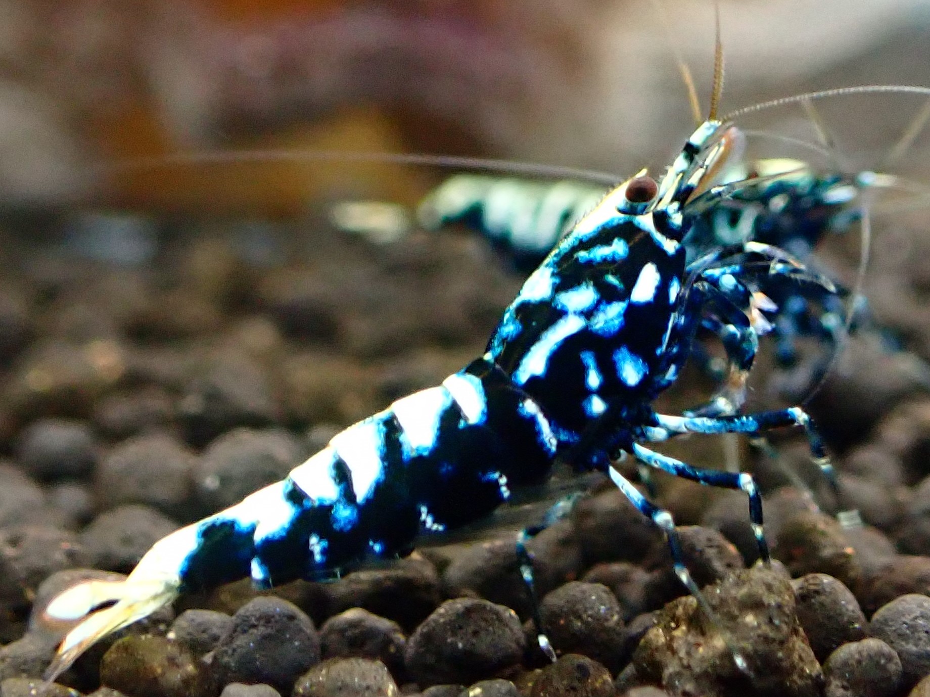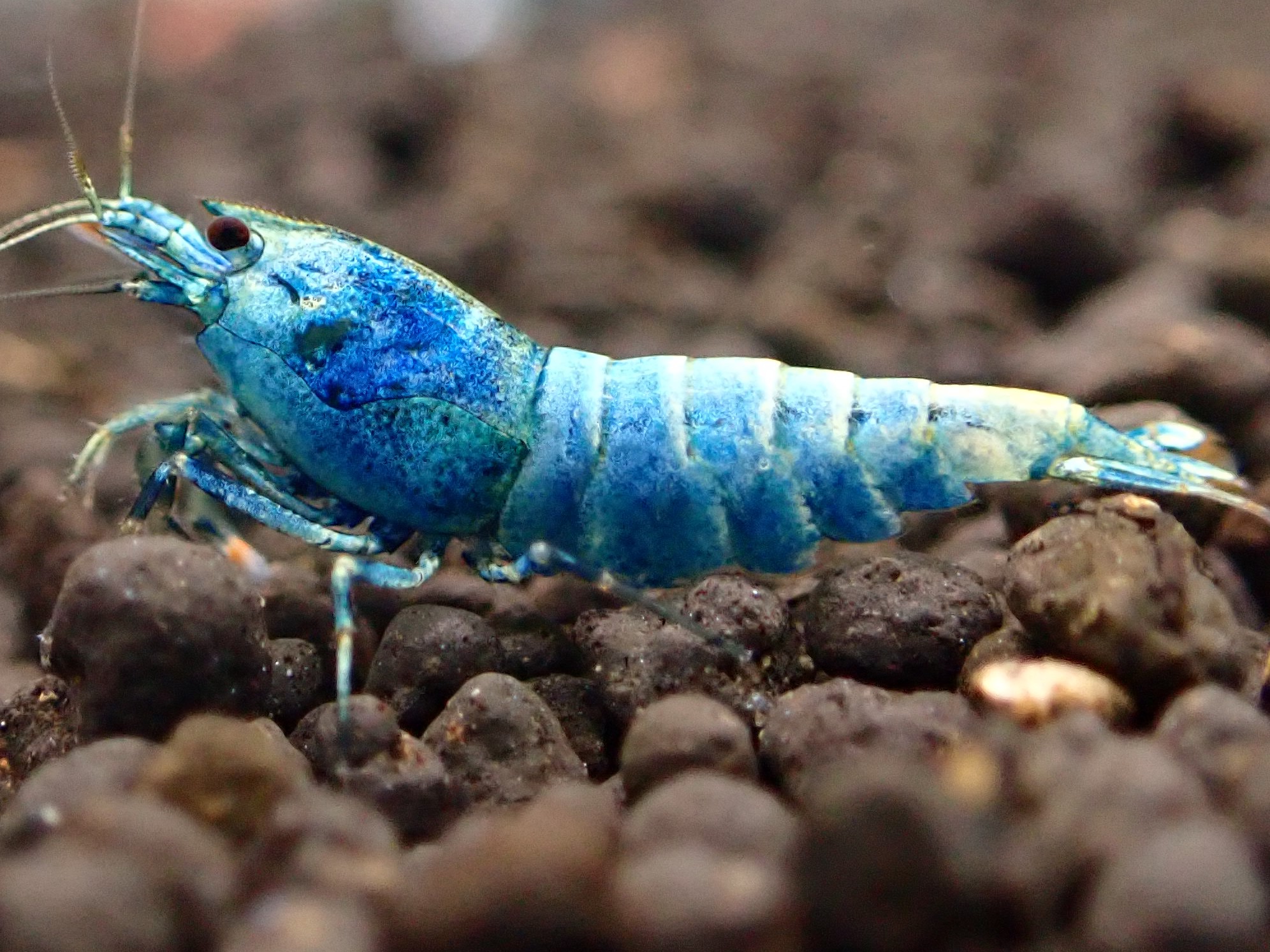 - ターコイズシャドーシュリンプはブラックシャドーシュリンプから作出され、白色の体にブルーが入るという全く異なる色彩からとても人気の高い種類となっております。